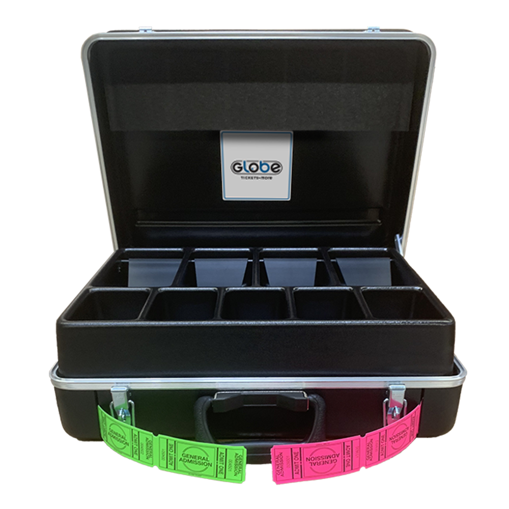The Carry Cash Ticket Case is a portable box office that expedites ticket issuing and change making in any sales location. The removable cash tray features five large wells and four bill compartments. The detachable foam cushioned lid holds change in place when traveling. The lid can be fashioned in the open position and used as a security shield or windscreen for outdoor sales. Additionally, the Case allows enough room for up to four 1” wide rolls or two double rolls of tickets that can be dispensed from the compartments underneath the cash tray and through the 2” wide slots. The Globe Ticket Carry Cash Ticket Case is the most durable and efficient case on the market.