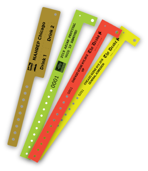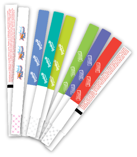 Your choice of .75” x 10” or 1” x 10” wristband with an assortment of colors. Security-cut adhesive closure to prevent transferring between patrons.